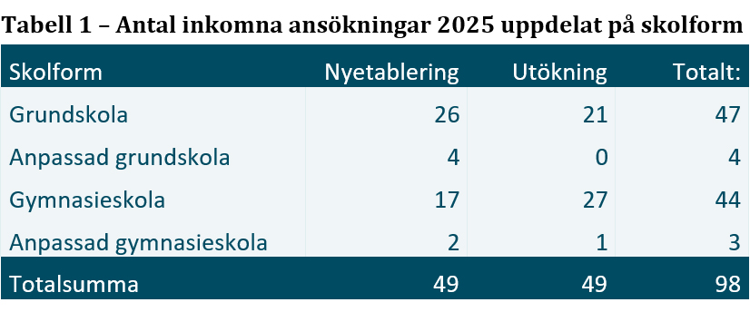 Skolinspektionen har under ansökningsomgången 2025 mottagit 49 ansökningar om att starta ny fristående skola och 49 ansökningar om att utöka en redan befintlig fristående skola med fler årskurser eller gymnasieprogram.
